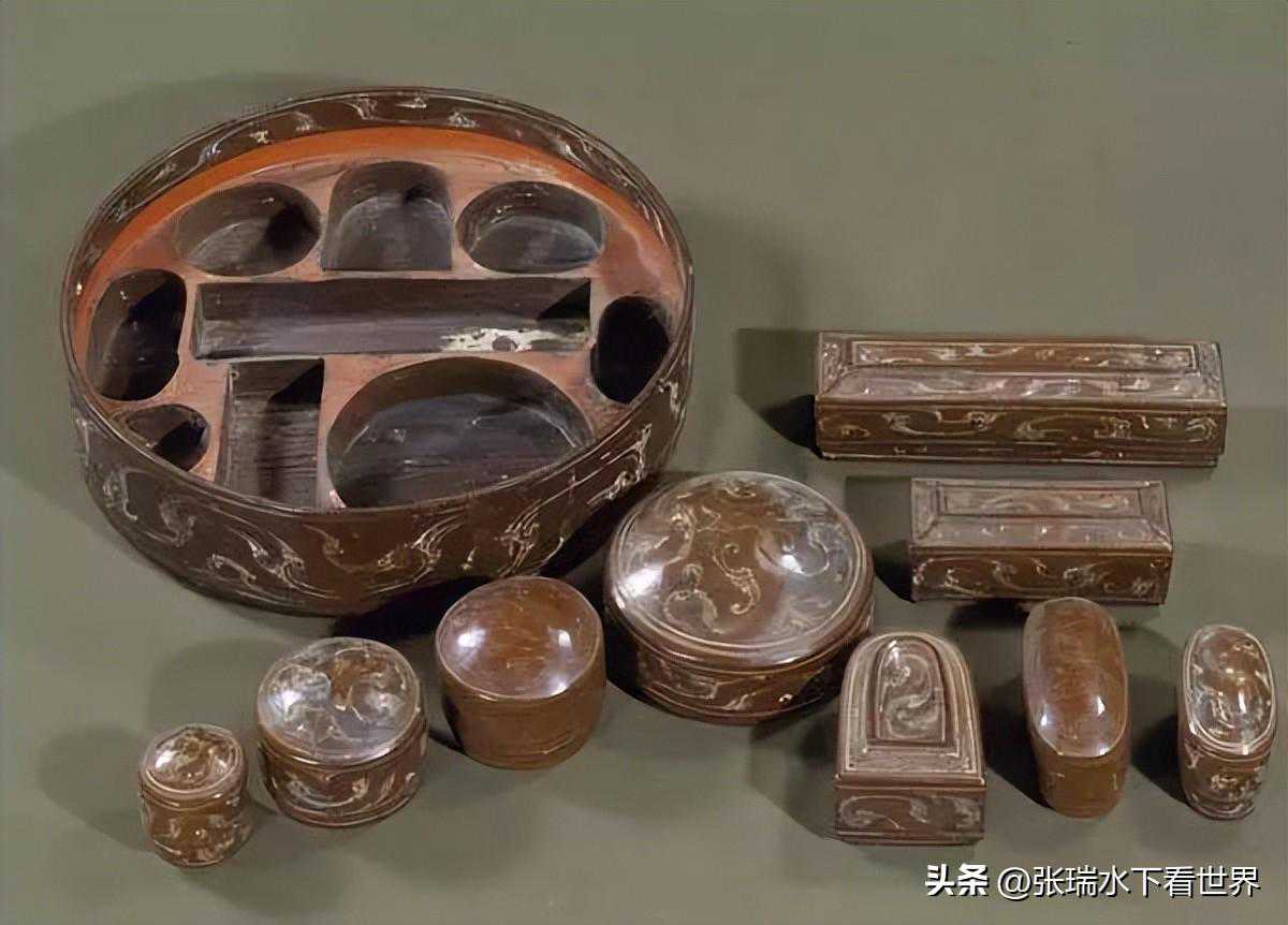长沙马王堆汉墓出土的双层九子漆奁。器身下层凹槽内放置9个小奁,内放化妆品、胭脂、丝绵粉扑、梳、篦、针衣等。