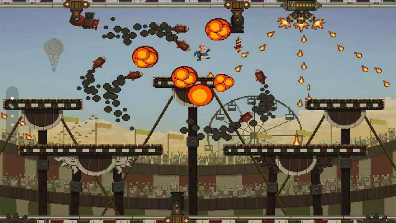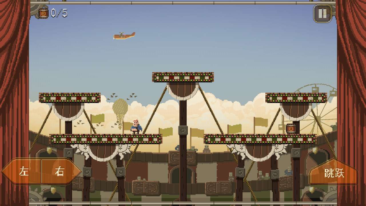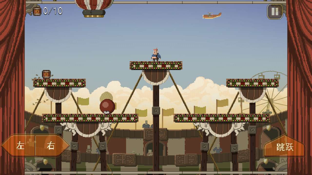 游戏嘛,讲真看起来是很简单的,首先要通关的是屏幕正中央的马戏团,一共分为十关,主人公要通过在台子间跳跃以采集箱子,掉下台子就没有命了,场面一度很血腥,心脏不好的朋友要慎入。第一关是用来掌握基本操作比如二连跳以便于在各个台子之间移动,相对而言还是比较容易通过的,第二关开始加入障碍,上面会有一个炸弹,主人公要在收集箱子的同时要躲开这些致命的障碍,而随着关卡数的增加,主人公的生存危机越来越大,对操作者灵活的要求也就越来越高。