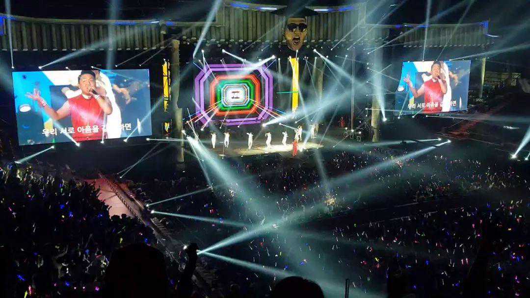整个舞台借鉴了韩国的传统建筑元素,传统的建筑元素和现代正流行的音乐相互碰撞,产生出奇妙的化学反应。以三块大屏幕作为整体舞台背景,辅之以高品质的灯光、音响设备,无限放大鸟叔的现场表演,创造一个狂欢的奇妙夜。