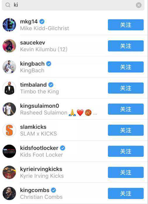 但当我们搜索关键词ki(詹姆斯的用户名kingjames)时却发现,已经没有了詹姆斯的身影。