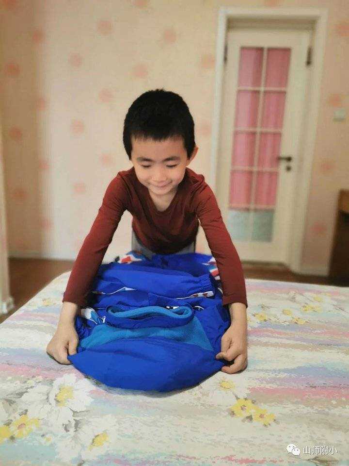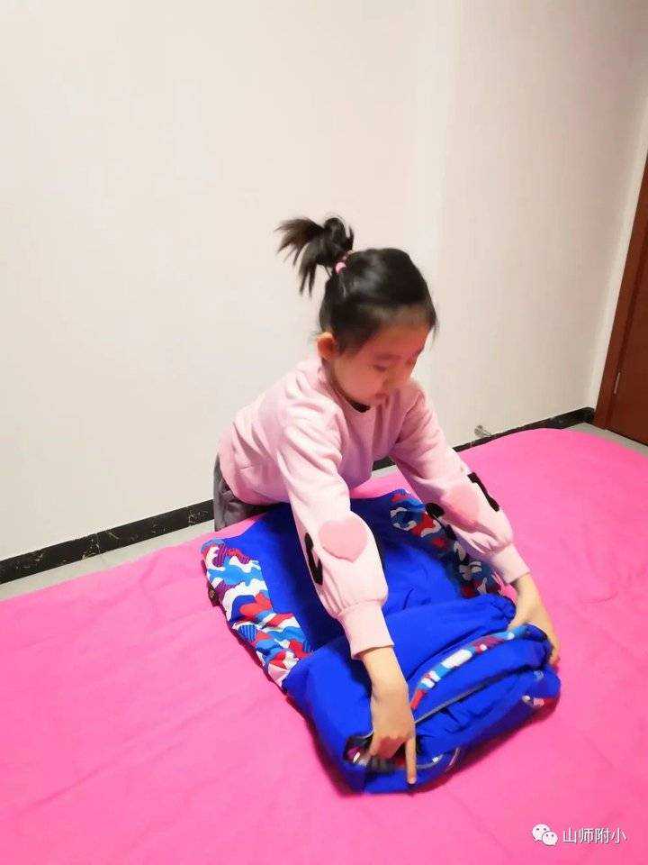 有的学生还编了叠衣口令:“衣服放平整,关上两扇门,左手右手抱一抱,点点头,弯弯腰,衣服叠好了!”