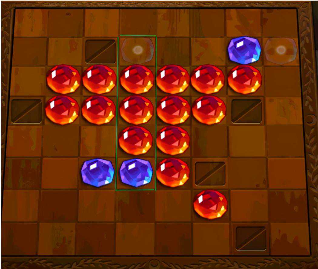 比如说下面的棋盘,绿色区域部分,在勇士进攻回合,可以拿一颗蓝棋子堵住3个红球。当然这种方法最好适合于"断头路",也就是棋盘上某一列或者某一排基本是红色棋子,就差一个位置没有棋子,勇士们可以下在所缺位置上,这样可以使棋子价值最大化。这种方式有一点不好,前期有可能比较被动,勇士需要点耐心去完成这样的翻盘。