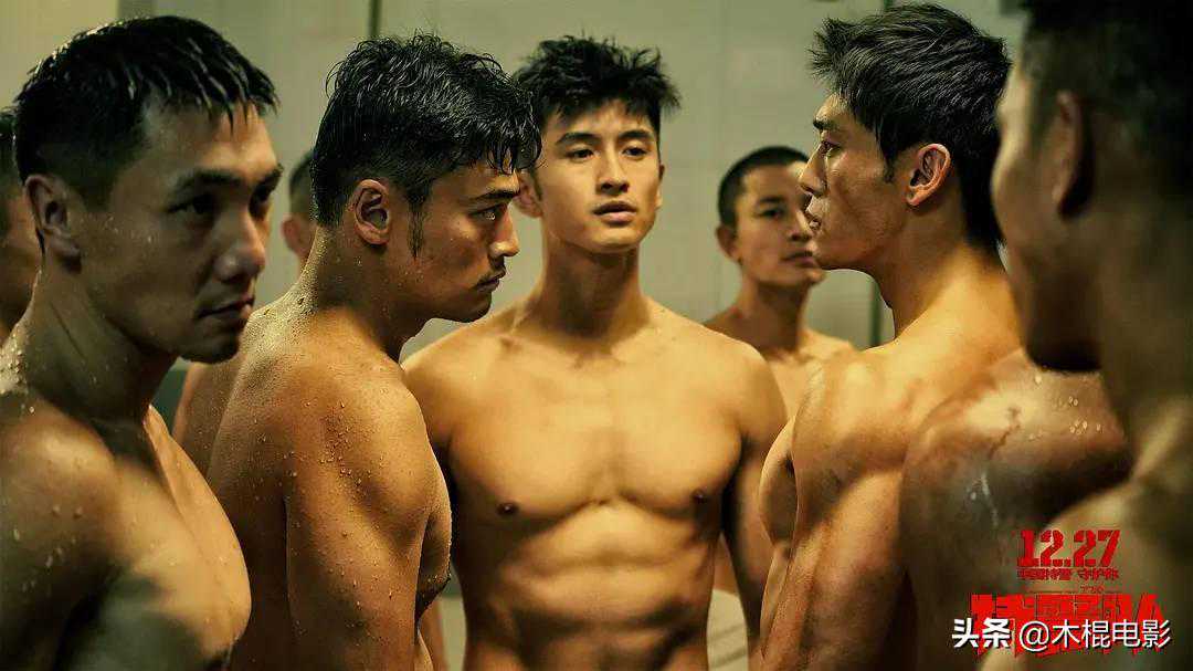 这应该是丁晟导演有意为之设定的剧情,一方面通过内部竞争关系增强电影的戏剧冲突,另一方面澡堂里大家都露出健硕的身材大秀肌肉,满屏的男性荷尔蒙飙升。后面的剧情中,这种秀肌肉的画面屡试不爽,凸显直男本色。只不过这画面让人不敢过度脑补。