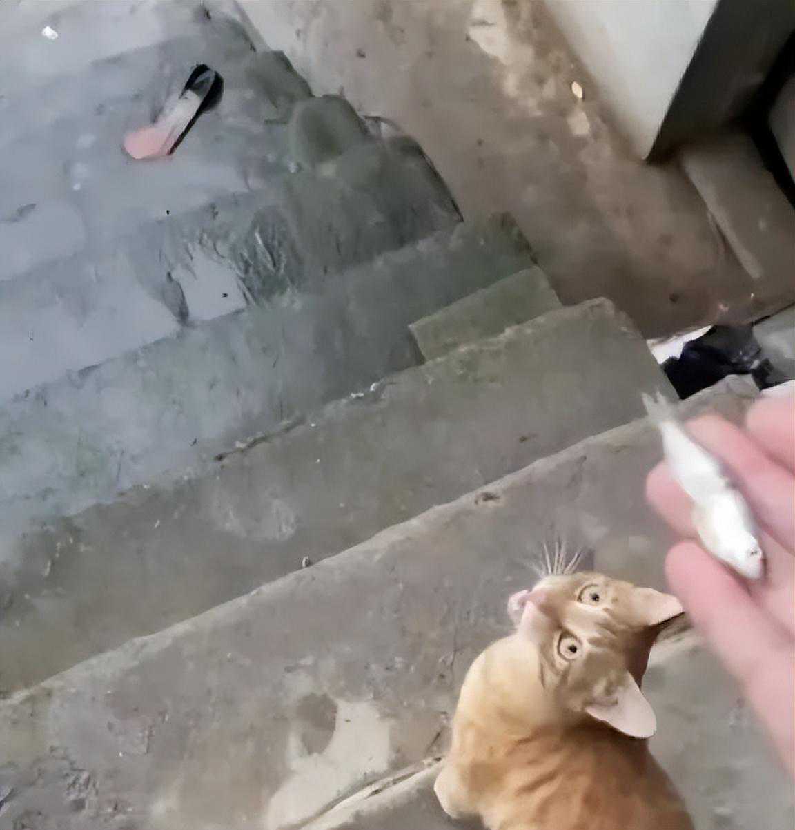 铲屎官抓着小鱼干,站在台阶上,准备抛出小鱼干喂猫。