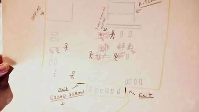 警方曾经公布过一张他画过的画,在画里,他自己化身为一个黑色的火柴人,从一张桌子移动到另一张桌子,手里拿着枪,追杀并射击着周围的人