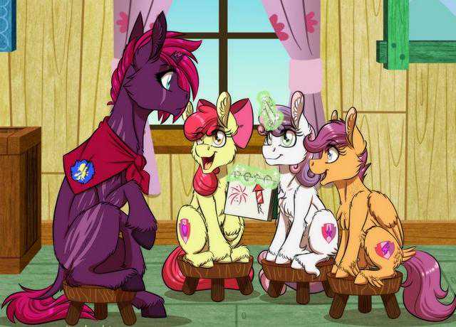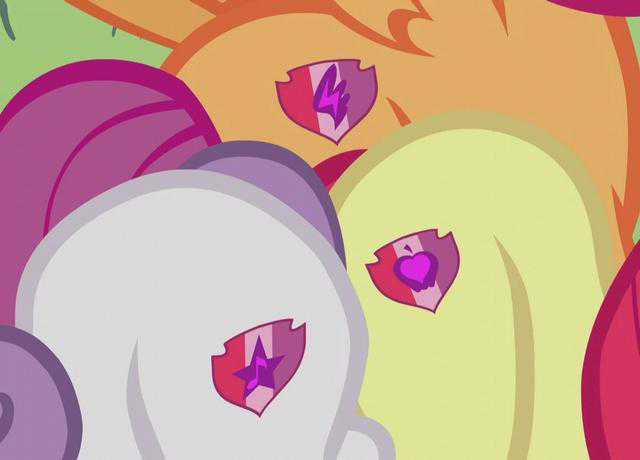 苹果丽丽是陆马,甜心宝宝是独角兽,而醒目露露是飞马,她们对于相互间相似的可爱标志感到非常满意。这里面有一些巧妙的设计,像是一个有三重象征意义的勋章,代表她们的才华就是帮助其他小马寻找到自己的天赋。另外,中间的图案代表了自己的特征。苹果丽丽的是一个苹果,代表着自己的苹果家族,甜心宝宝是一颗五角星,代表自己像姐姐珍奇一样,想成为小马界的一颗明星,而醒目露露是一道闪电,就像她的偶像云宝一样,飞行的速度能极速到像一道闪电。