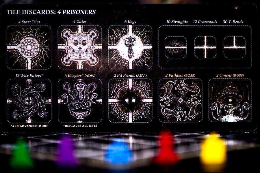 玩家每次移动时,会在抽牌库中抽取板块自行选择放置,板块中包括通道(十字、丁字、直线)、钥匙、大门以及可怖的噬烛怪。