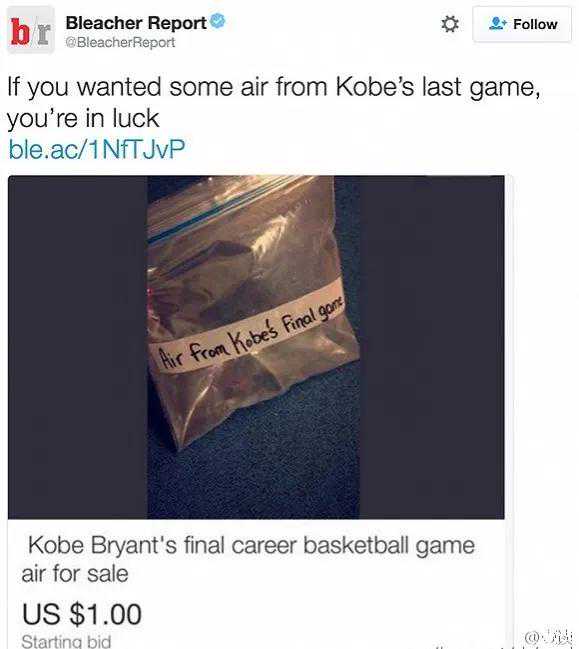 最终,已超过3万美元的价格被一名球迷成功拿下这条科比原味毛巾,当然,这确实是有着特殊纪念价值的。斯台普斯上空洒下的紫色气球,空中飞舞的纸片,球馆的优惠券,只要是现场沾边的东西都被人挂在了拍卖网站上。科比最后一场比赛的空气竟然也被球迷放在了拍卖网站上出售这把塑料袋装的空气起拍价为一美元。而被网友95次抬价之后,最终的成交价达到了15500美元。