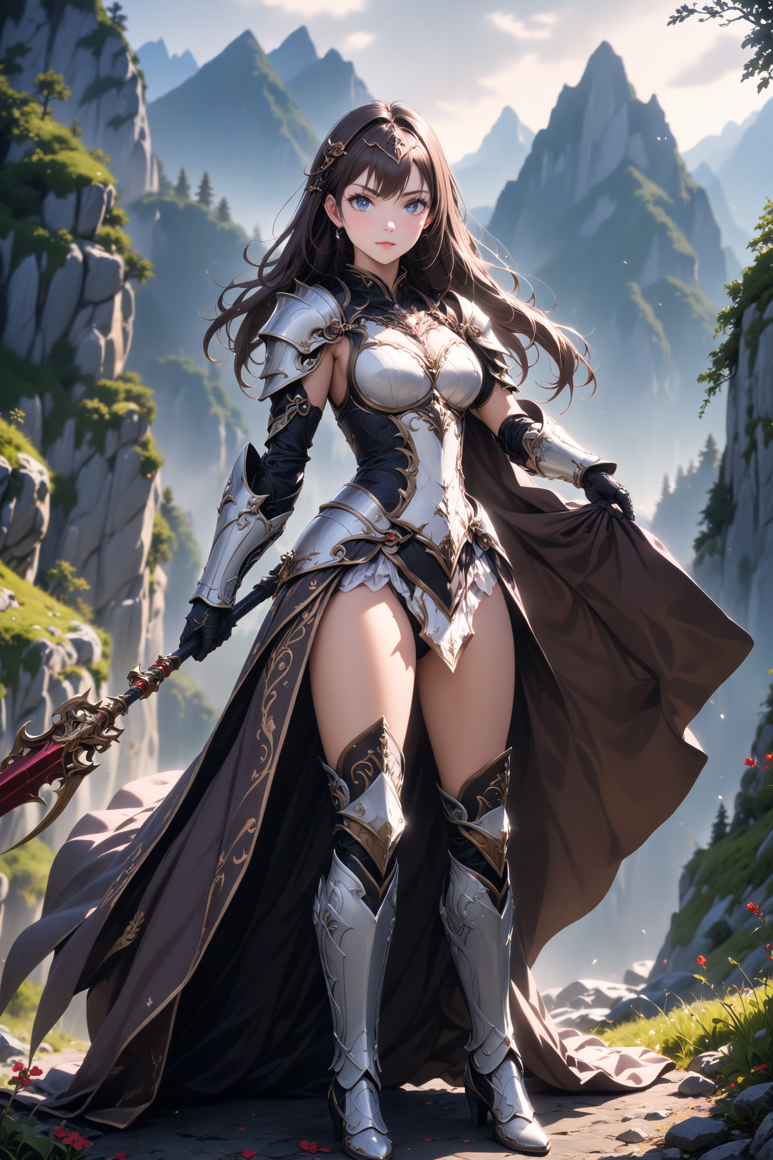 (masterpiece:1.2),(bestquality:1.2),superhighresolution,intricatedetails,ai-generated,perfectanatomyRuleofThirds,emptyspace,lowangleshot,dutchangle,dynamicactions,acharacterportrait,fantasyart,fantasypaladinwoman,girlinwhiteandredknightarmor,solo,(Martialartsmovement:1.2),Randommartialartsmoves,longhair,lookingatviewer,blueeyes,brownhair,standing,outdoors,hemline,cape,armor,blurrybackground,shoulderarmor,gauntlets,pauldrons,mountain,dynamiccomposition,(masterpiece:1.2),(bestquality:1.2),superhighresolution,ai-generated,perfectanatomy,