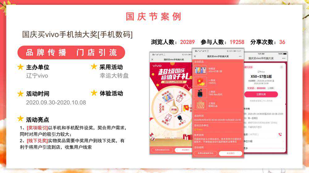 如上图国庆节这场活动案例,20289人浏览,参与人数19258人,通过奖项吸引,线下兑奖,进行品牌传播的同时,为门店引流,收获了一批红利。