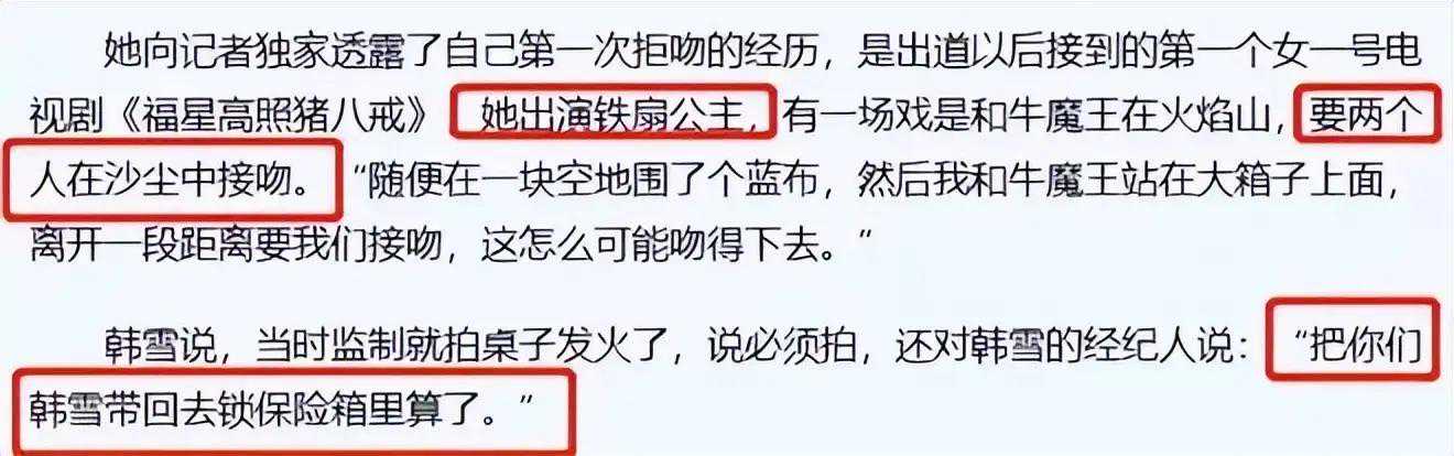 但韩雪丝毫不做改变,还在节目中公开表示,如果导演非要自己拍吻戏的话,说明他们不是一路人,下次别找她演戏了。再者,这个损失,她失得起。