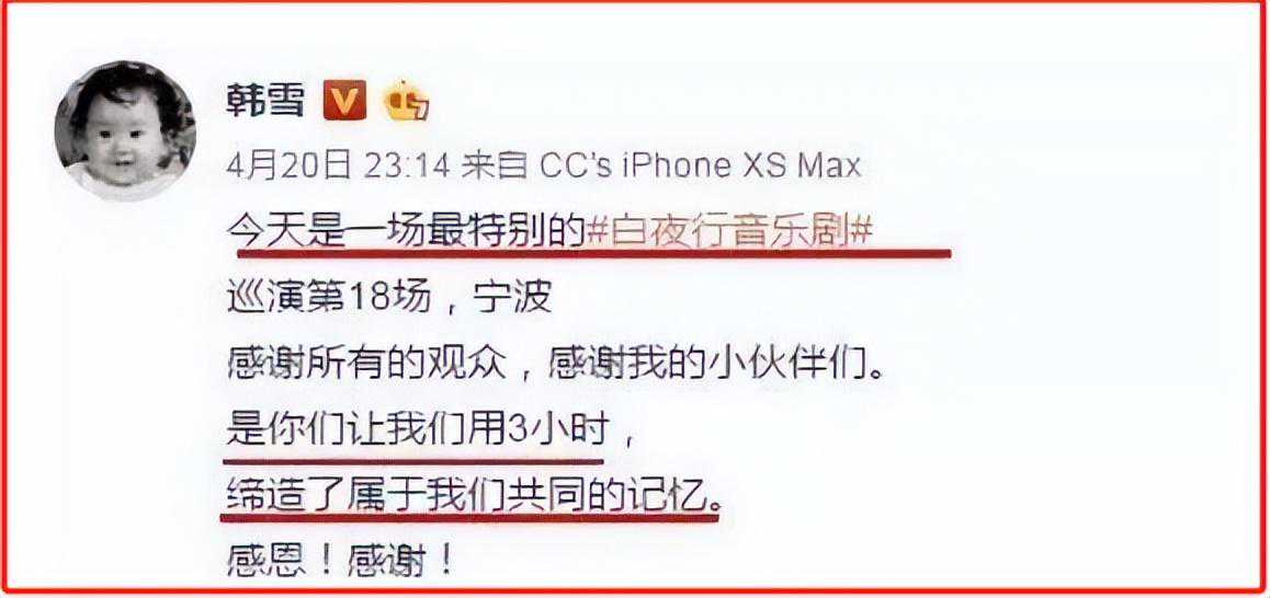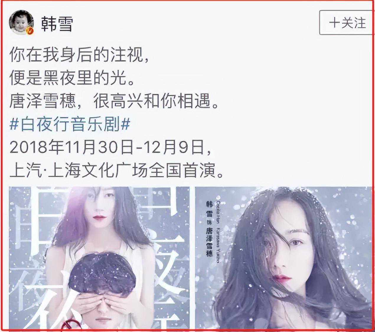 演出结束后,主办方形容这一场“有些不完美,是成就完美的另一种方式”,韩雪说“今天是一场特别的《白夜行》音乐剧”,粉丝们对韩雪带病演出,是一阵阵的心疼与骄傲。