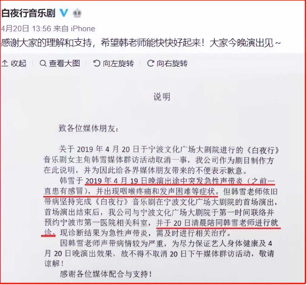 另外,即使没有B角,早点取消也行啊。看韩雪的社交账号,4月17日,感冒;4月19日,不能发声;4月20日,主办方还因韩雪的声带问题,而取消了媒体的群访活动。