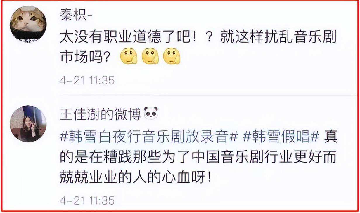 这还不是最糟糕的。2019年4月,韩雪和刘令飞主演的音乐剧《白夜行》,在宁波上演。但韩雪因为生病了,不能真唱,所以她唱歌的部分,是放录音的。一场音乐剧,女主唱歌对嘴型,也算是创了行业史上的一个“神话”了。