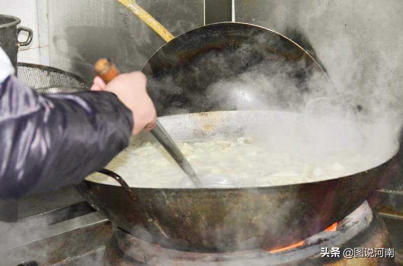 包好的饺子被推进锅中,与热气腾腾的水不停的碰撞交融。大厨的铁勺推动这些饺子不停的翻滚,大铁锅中一片热闹景象。