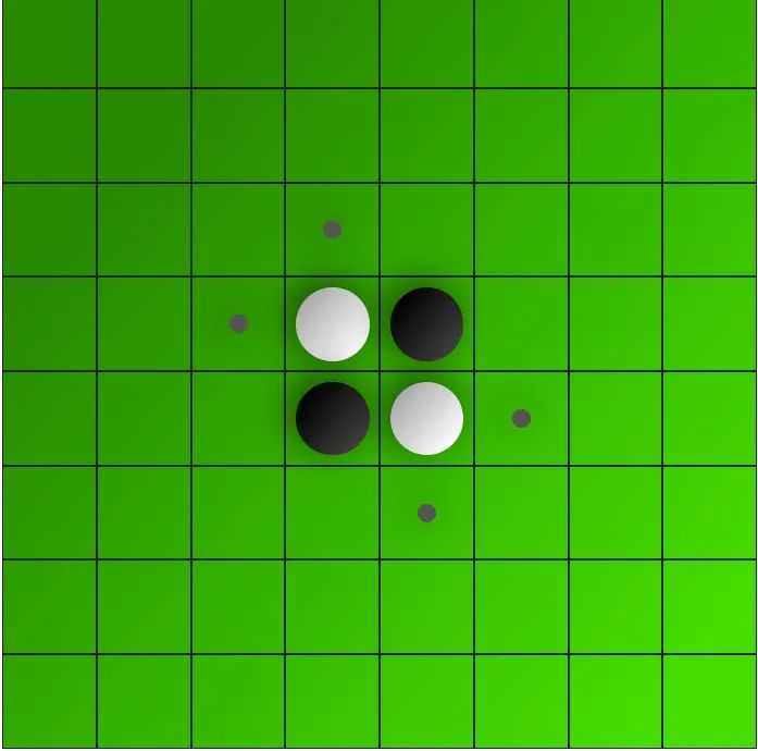 •最标准的开局,棋盘正中央的4格先置放黑白相隔的4枚棋子。通常黑子先行,双方轮流落子。