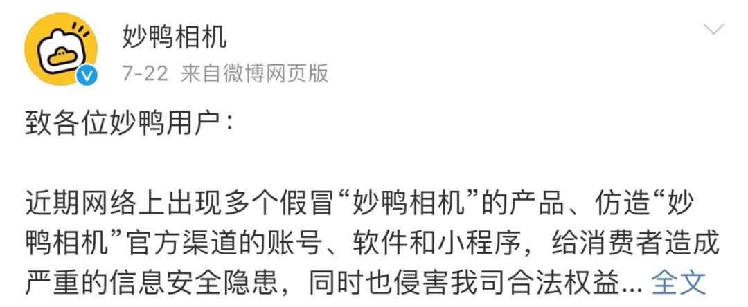 上线不足半个月,妙鸭相机团队已发布2次公告称,市面上出现多款假冒产品,请用户注意甄别。