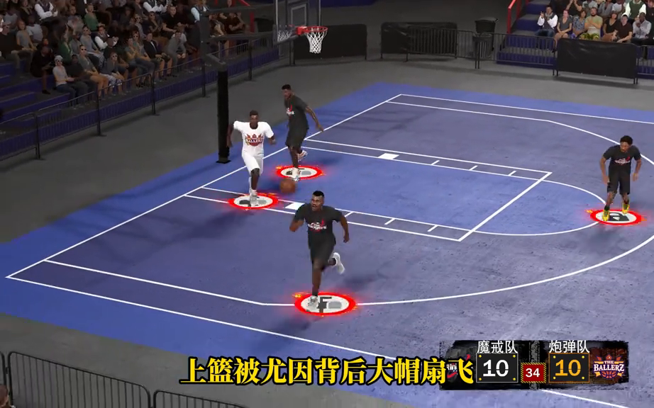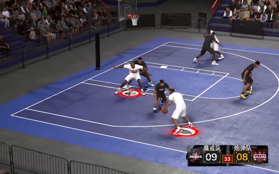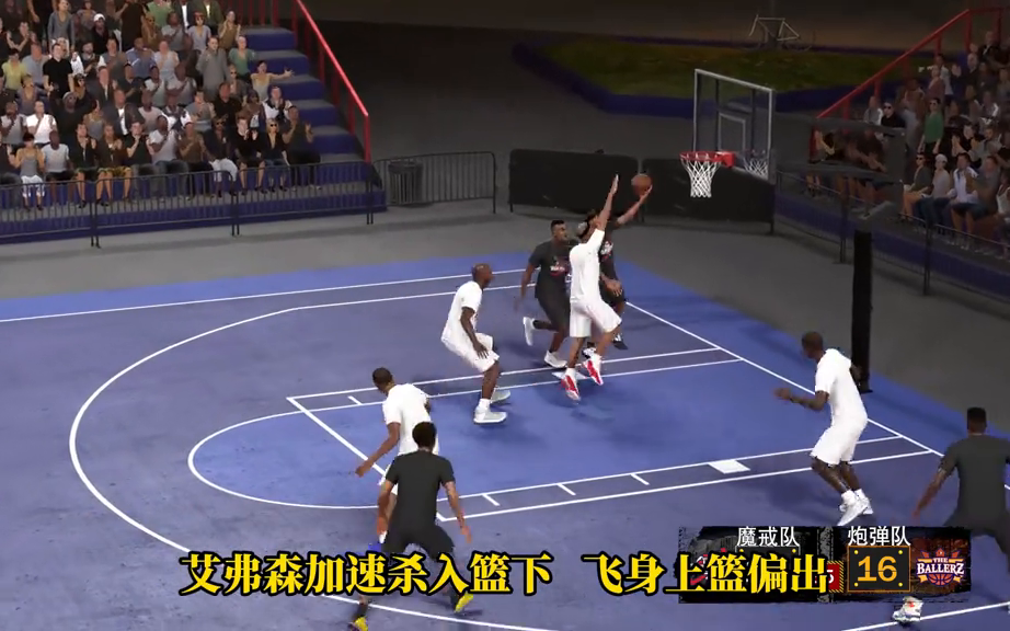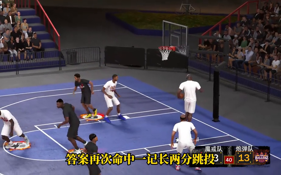 ·艾弗森持球突破,一个加速直扎篮下,但是这球被补防的奥尼尔干扰,转换过来。麦迪单挑好基友科比,连续胯下变向杀入篮下,左手抛投打进,2:3,白队反超比分。艾弗森带过来拜佛假动作,接胯下变向突破,急停跳投出手,稳稳命中3:3平。