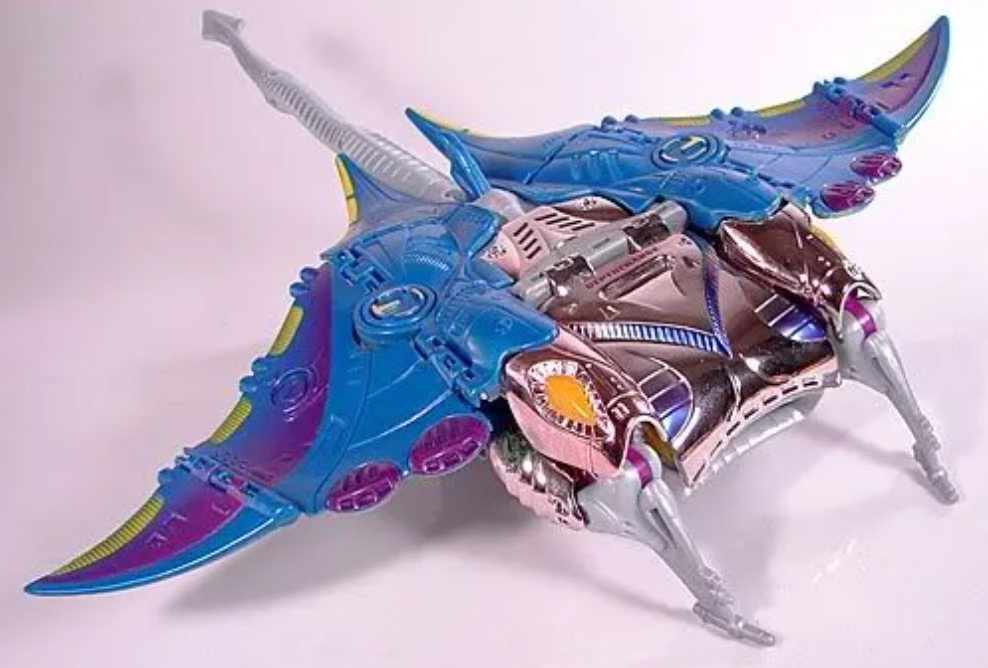 蝠鲼形态下,双鳍和尾部都有多段活动关节,可以摆出极佳的游弋姿势。闪闪发光的电镀涂装在鱼形态下非常亮眼。小鲨鱼枪可以通过插槽安装在大蝠鲼的腹部,很有那种类似海洋中一些小型鱼类会依附在大鱼身上搭免费公交车的感觉。
