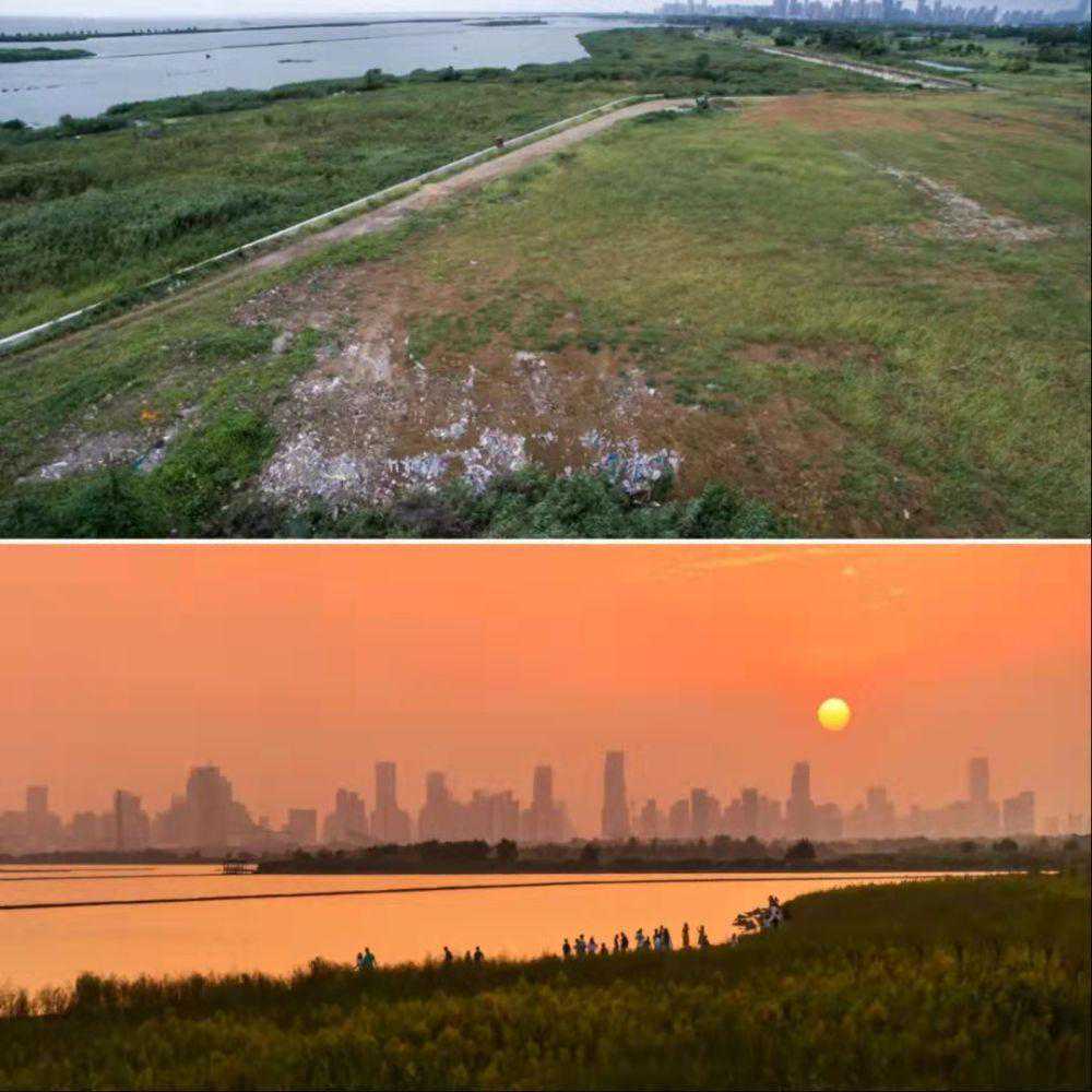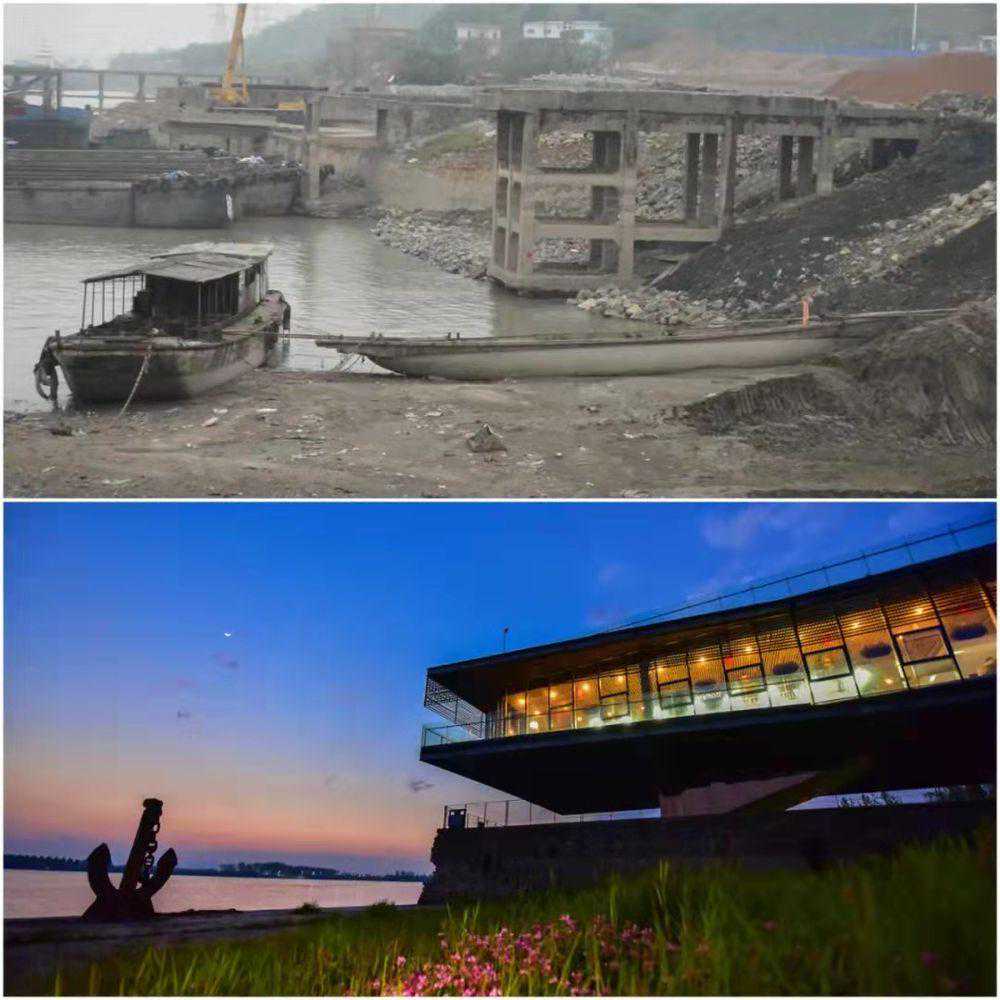 上图:2013年11月14日拍摄的安徽铜陵滨江码头(詹俊/摄);下图:2019年5月5日拍摄的安徽铜陵滨江生态公园一隅(郜小兵/摄)