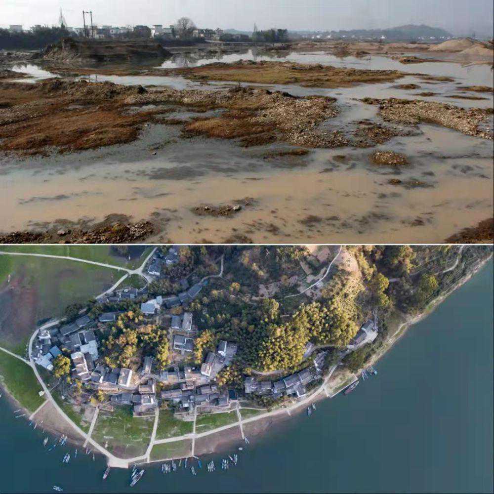 上图:新安江源头之一的横江上,采砂后洗砂污水直接排入河流,造成水质变差(2008年1月5日摄)。下图:新安江山水画廊(2019年11月15日,新华社记者韩晓雨/摄)