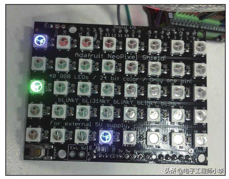 初始化LED阵列,建立一个类型为Ada_NeoPixel、名称为strip(可更改)的对象,3个参数分别为LED的总数、与Arduino连接的pin以及像素类型。这种LED可以通过一个数字控制脚控制每一个单独的LED,非常方便。