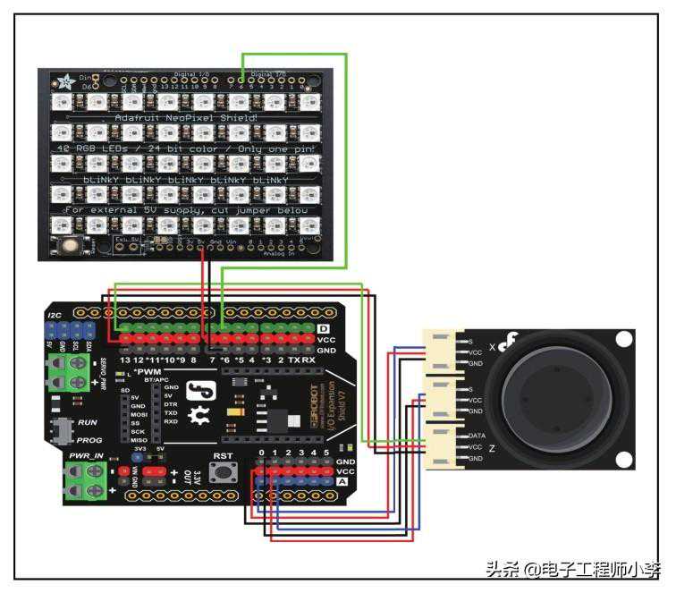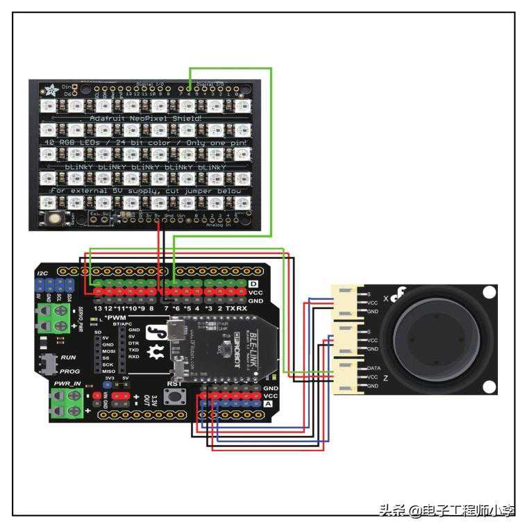 我尝试了两种玩家2的操控方法:一种是利用BLElink蓝牙模块,用现有的GoBLEApp(见图5.1)来控制食物的移动,但是每次移动时,上、下、右三个方向都会使(0,0)灯变成蓝色灯(见图5.2),值为1,向左移动正常,我个人认为Arduino代码并没有问题,怀疑是GoBLE的库有问题,还希望大家能一起讨论一下。另一种方法是用键盘,借助Processing控制食物。第一种方法的接线图如图5.3所示,第二种方法的接线图如图5.4所示。JoyStick-X接PinA0,JoyStick-Y接PinA1,JoyStick-Z接Pin13,NeoPixelsShield接Pin6。