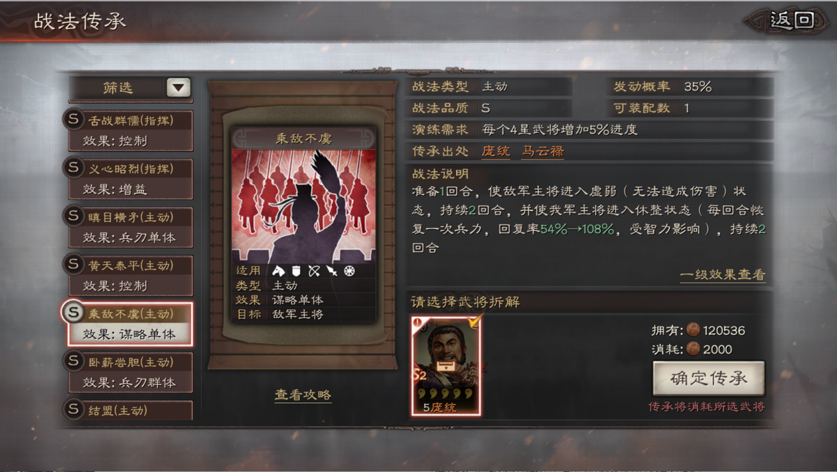 传承自诸葛亮的战法,属于指挥控制型战法,具体的效果是:“敌军尝试发动主动战法时,有15%几率令其发动几率降低5%(受智力影响),并提高自己及随机友军主动战法2%(受智力影响)发动几率,持续1回合”超低的触发概率拉低了这个战法的强度,15%太感人了,基本上可以忽略不计了,即便触发也只能持续1回合。个人认为这个触发概率的设计太不合理,如果是35%的概率估计有些玩家是愿意带的,不过诸葛亮还是得留着,无论是蜀智麒麟弓还是草船借箭,都需他!
