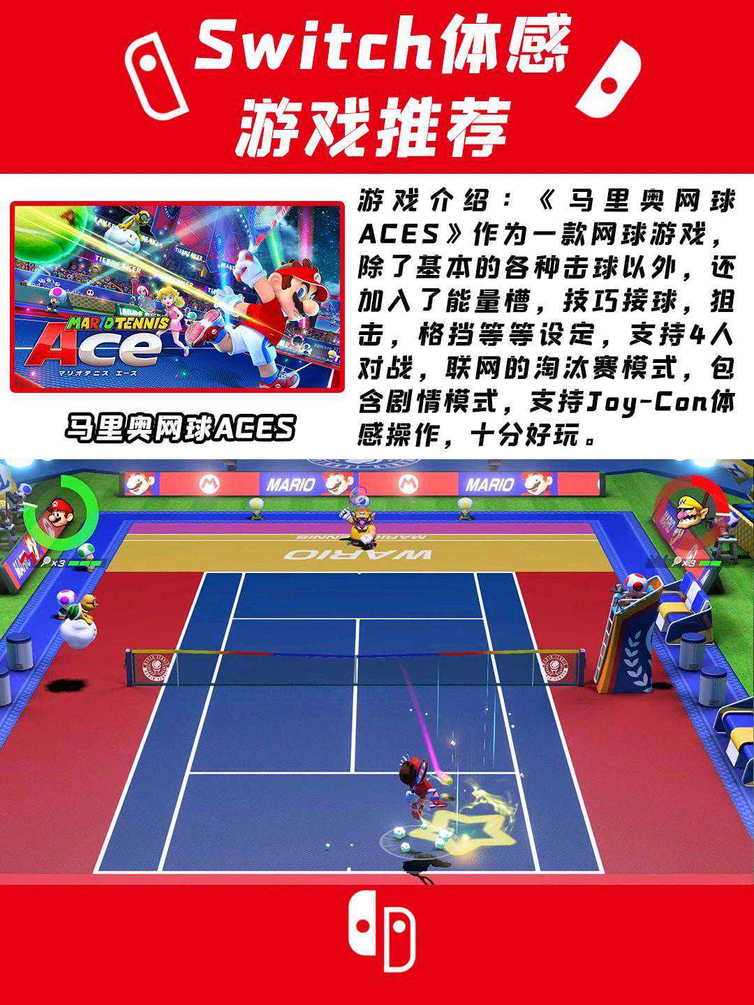 游戏介绍:《马里奥网球ACES》作为一款网球游戏,除了基本的各种击球以外,还加入了能量槽,技巧接球,单击,格挡等等设定,支持4人对战,联网的淘汰赛模式,包含剧情模式,支持Joy-Con体感操作,十分好玩。