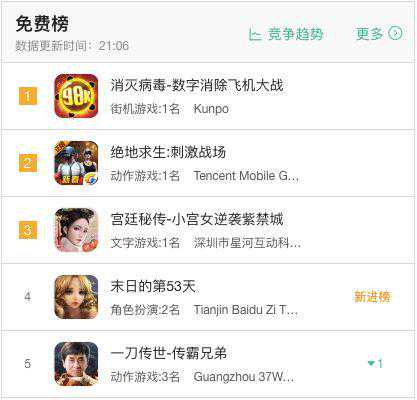 这款游戏名为《消灭病毒》,是一款兼具竖版飞行射击和数字消除的休闲游戏。从上线之日起,它就一直身处高光之下——2月1日,游戏首日便高居免费榜第3;2月6日,一度跃居免费榜首,随后被《刺激战场》超越;2月9日,游戏再度反超,截至发稿前仍稳坐头名位置。