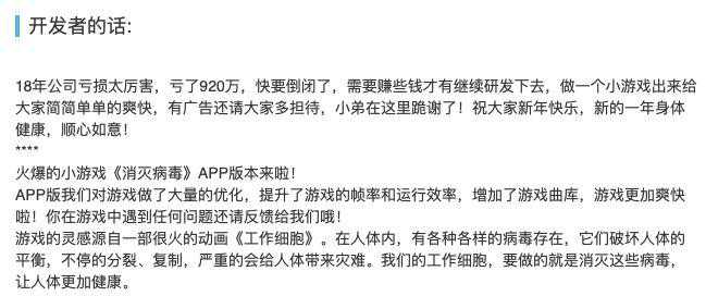 抛开热度,《消灭病毒》还是一款定位特殊的产品。其研发团队Kunpo表示这是一款给团队“回血”的游戏:“18年公司亏损太厉害,亏了920万,快要倒闭了,需要赚些钱才有继续研发下去的粮食,做一个小游戏出来给大家简简单单的爽快,有广告还请大家多担待……”当然也是因为游戏内的付费点,游戏引发了不少质疑和讨论。