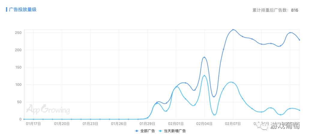 AppGrowing数据显示,1月29日至2月13日间《消灭病毒》累计排重后的投放广告数有817个,2月7日当天投放最多,为259个,2月4日除夕的新增广告最多,为126个。