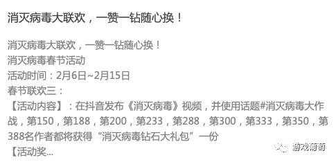 广告文案方面,游戏尝试贴合春节热点,比较有代表性的包括“过年拜访亲戚太无聊下了个消灭病毒,竟然如此好玩!”等等。