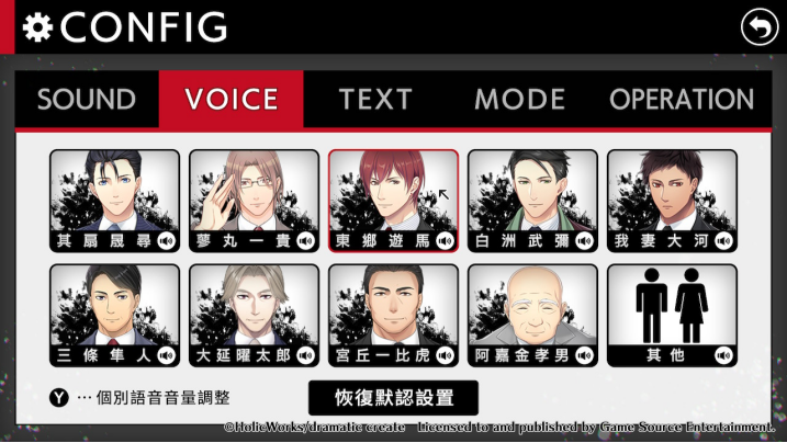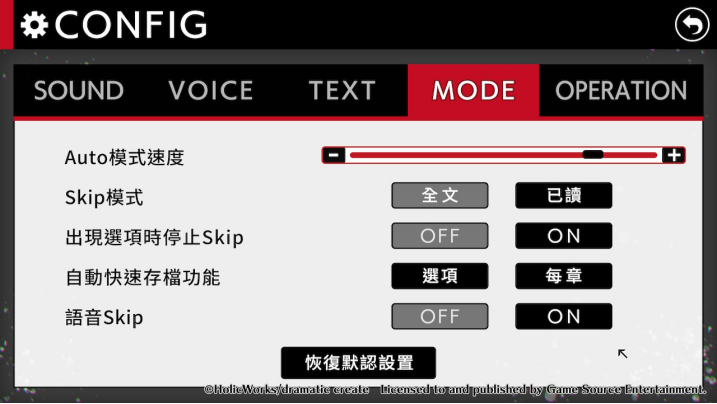 游戏背景音乐,系统音量及个别角色音量大小、文字速度及显示样式、快速存档、Skip及Auto模式、按键设定等,皆可在此进行调整。