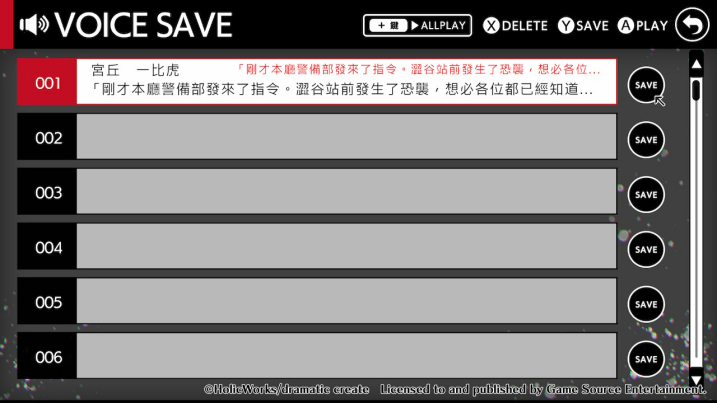 游玩途中遇到心仪的台词,在对应的对话框右方按下【SAVE】键,即可储存该段语音及对白,随时重温心动瞬间。