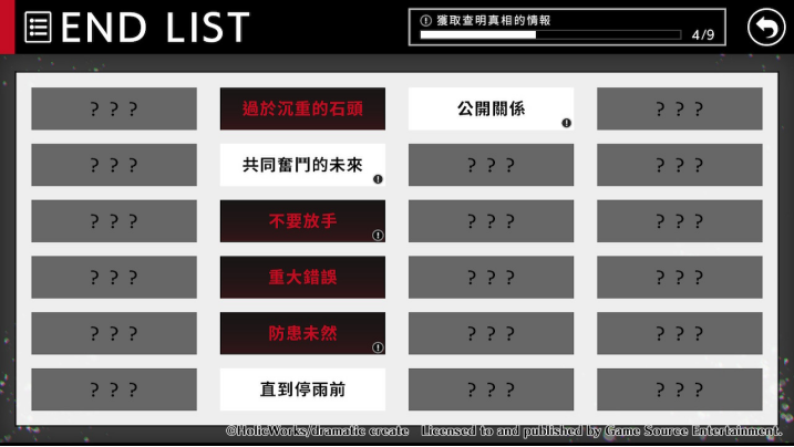 可查看已获得的结局以及获取查明真相情报的完成度。