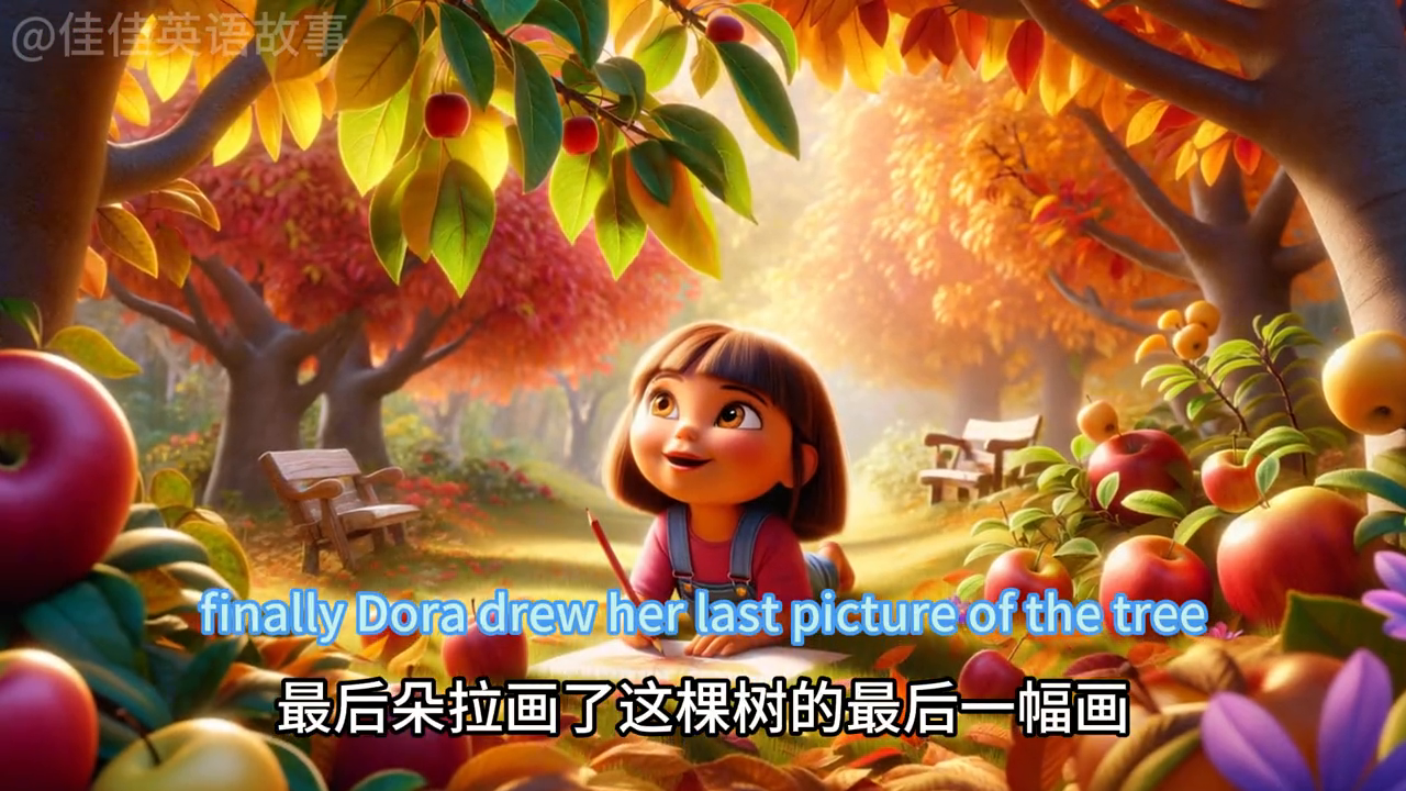 最后朵拉画了这棵树的最后一幅画,它有很多红苹果。现在是时候回家了。当她进屋时,爸爸妈妈在沙发上等她,他们每个人怀里都抱着一个婴儿。现在你有一个妹妹和一个弟弟。爸爸说:我是世界上最幸运的姐姐。朵拉高兴地说:看他们的脸像红苹果一样圆,他们太可爱了。