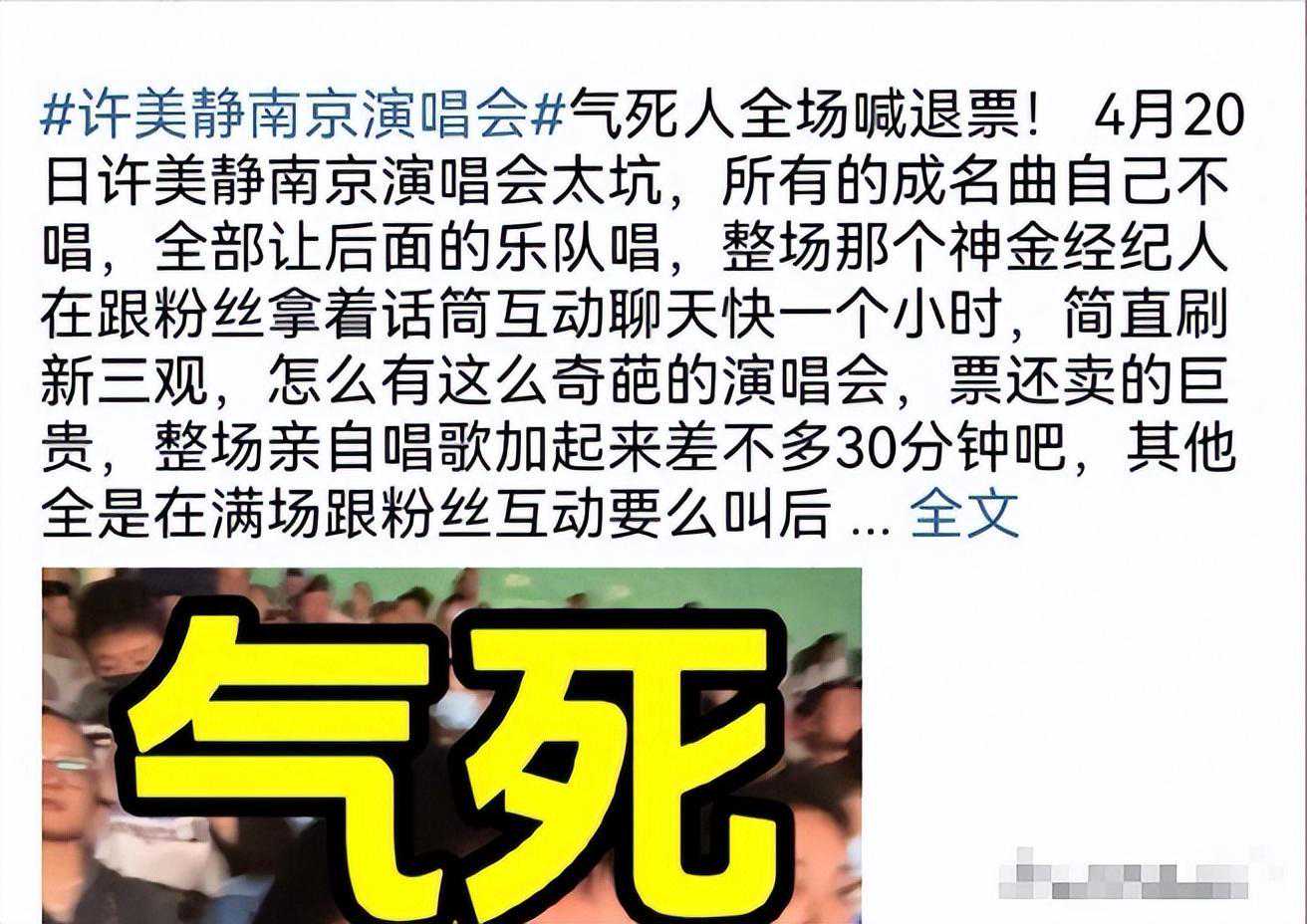 闹大了!许美静南京演唱会全程划水,歌迷愤而离席,集体高喊退票