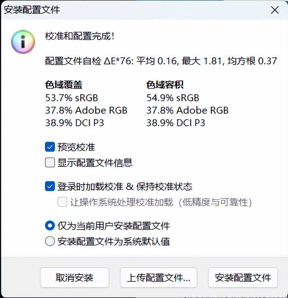 打开B面,是一块1080P144Hz的IPS电竞屏,色彩覆盖比较少。属于45%NTSC的低色域屏。不过在这个价位也实属正常。实测色域覆盖则为53.7%的sRGB,色域容积为54.9%的sRGB,亮度约为250nit。