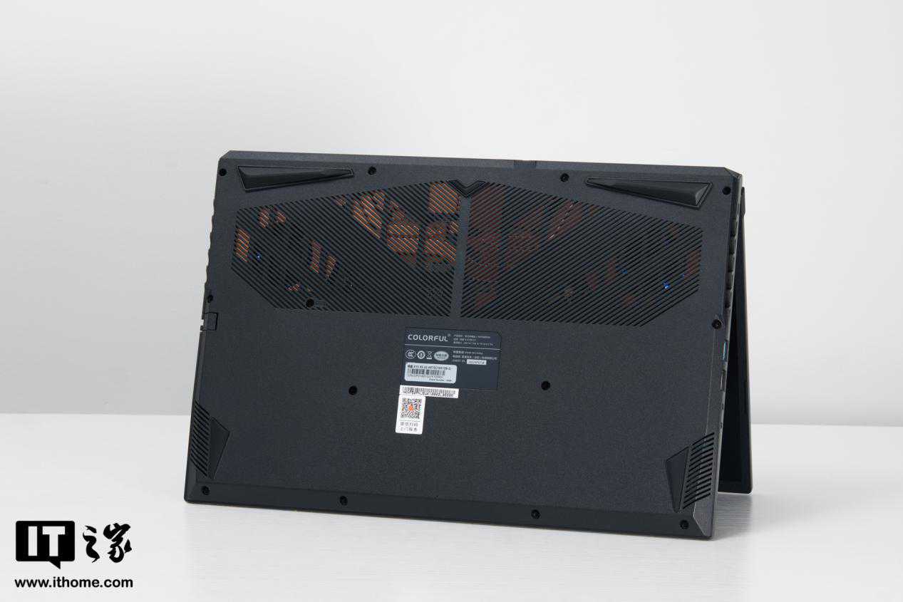 D面是塑料材质,有垫高设计和大面积的进风口,从镂空的底盖中能看明显看到巨大的铜管散热模块,具体的散热设计我们稍后拆机就知道了。