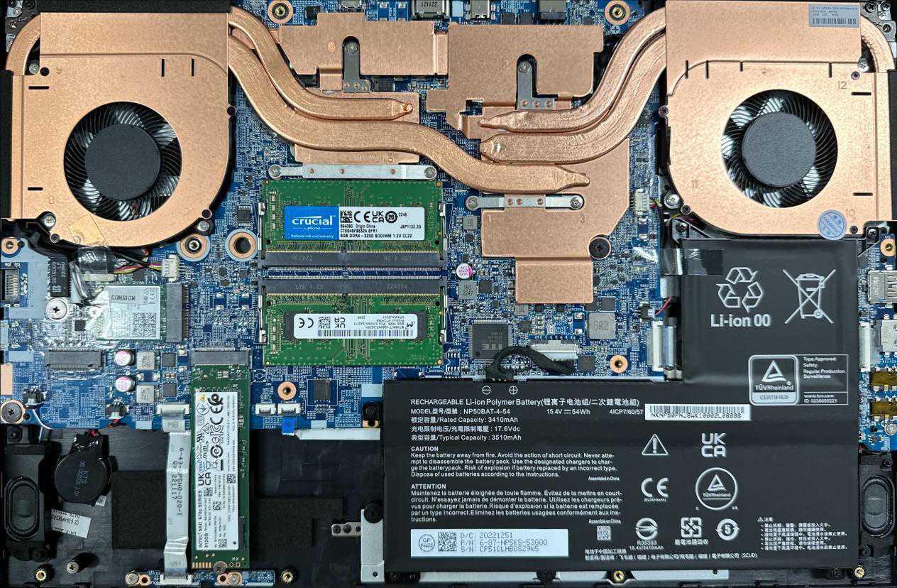 那么,将星X15XS的模具带不带得动这一代全面升级的配置呢?我们接下来就拆机看看吧。从下图可以看出,将星X15XS22依旧是采用一个四热管双风扇的散热模组,并且在热管上覆盖了一层铜板,起到了一定均热的效果,相比于传统的热管导热能力更强。