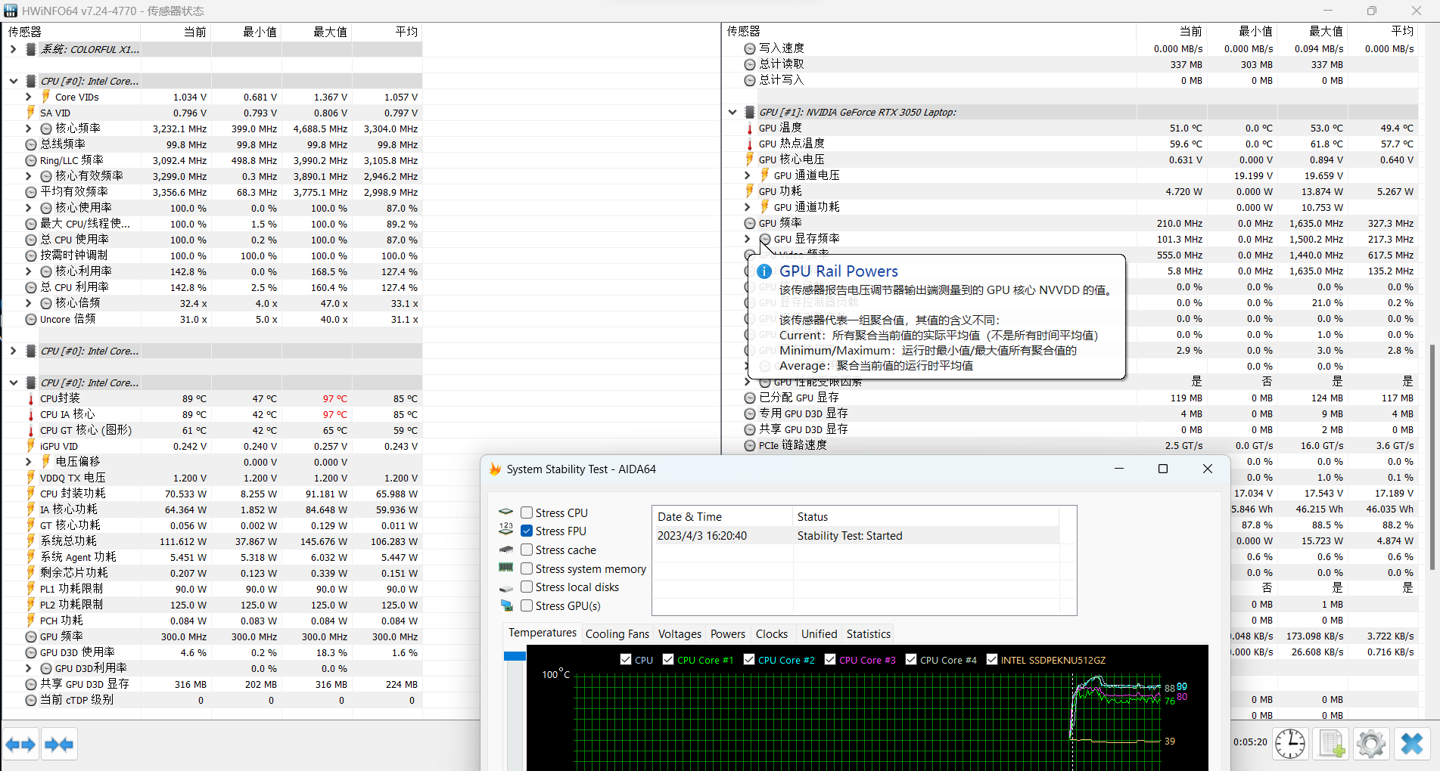 接下来我们同时运行以上两款软件,模拟最大的压力,运行15分钟的双烤。15分钟后CPU稳定在27W、68℃,GPU稳定在84W、75.3℃,整机性能释放约110W,这个性能释放还是很够用的。