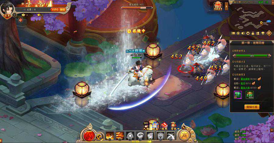 游戏剧情开始于第一章.夜闹花楼主线任务,玩家将在屋檐开始对鳌拜派兵围困春花楼进行调查和解围,抢先体验到职业技能和能乘骑坐骑作战的骑战模式。玩家职业技能共有4个,游戏初期只开放有「千军斩」第一个技能,其他技能则需等级提升逐步解锁,技能的解锁是无需消耗道具物品。