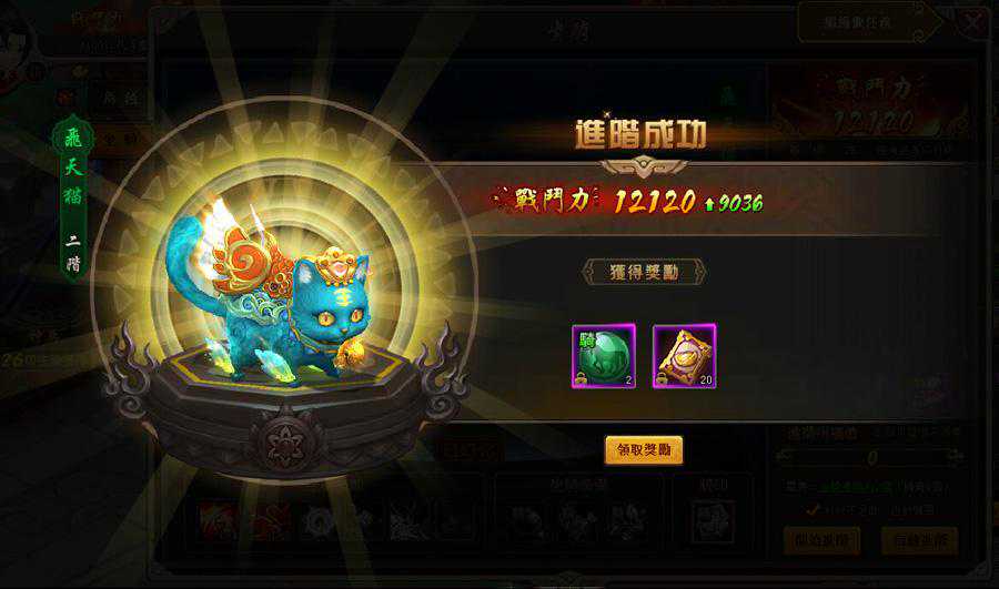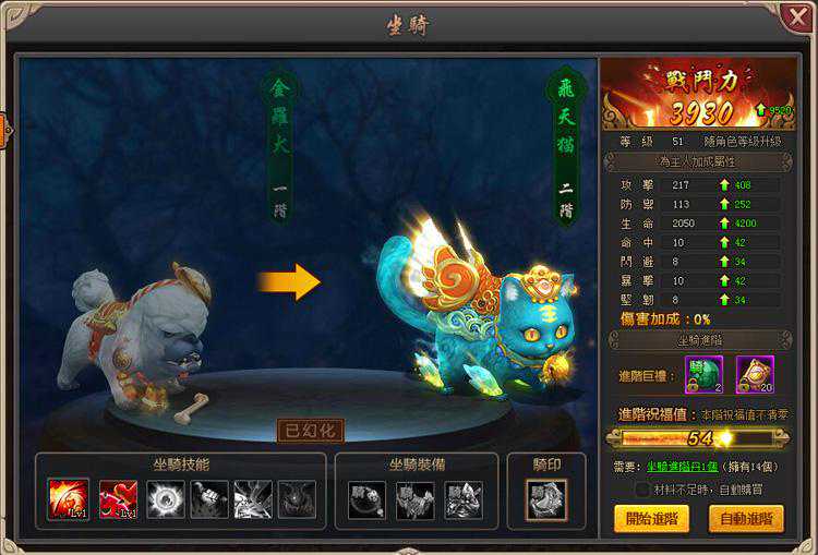 坐骑进阶成功可获得进阶丹和绑定元宝奖励,同时还能激活新坐骑技能