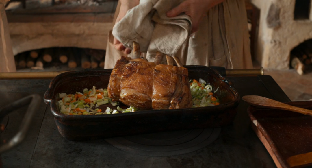 有意思的是,厨房里的欧仁妮和两位学徒也吃着相同的菜品。