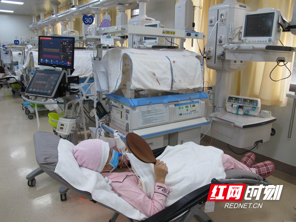 3月8日,体重仅2.335千克的小宝宝杨某躺在保温箱里,其母彭女士在严格做好消毒措施后来到病房,迫不及待地等着跟宝宝进行第一次“袋鼠式护理”。“妈妈可以跟宝宝说说话,或者让他听下音乐,轻轻抚摸他的背……”在护士的指导下,彭女士躺在舒适的靠椅上,小心翼翼地轻抚着怀中的宝宝,从镜子里观察宝宝的表情变化,因与孩子分离而产生的焦虑情绪也得到缓解。28、30、35、48、61……随着袋鼠护理的进行,小宝宝的奶量从最初的28毫升上升到出院时的73毫升,目前宝宝体重已增加到9.8千克。