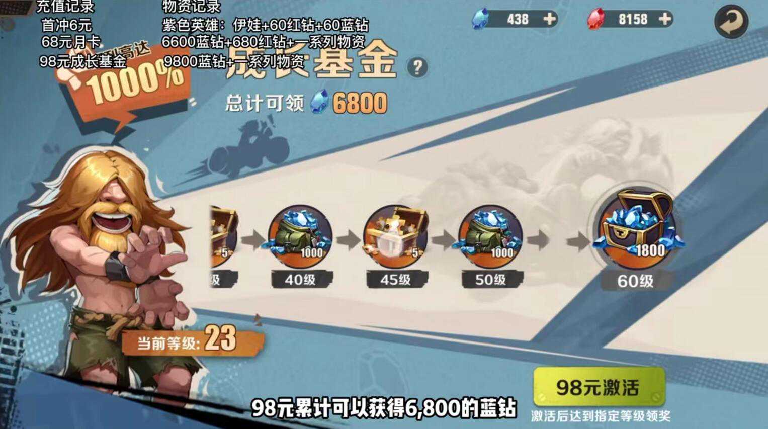 还有就是玩家都非常熟悉的成长基金活动,虽然这个98没有双月卡那么的划算,毕竟人家6600钻石就压制它的总计可领6800,人家还带特效和额外红钻,虽说性价比不高,但还是要入手的哈,为了存够298那个充值挡位,成长基金是必须安排在里面的.