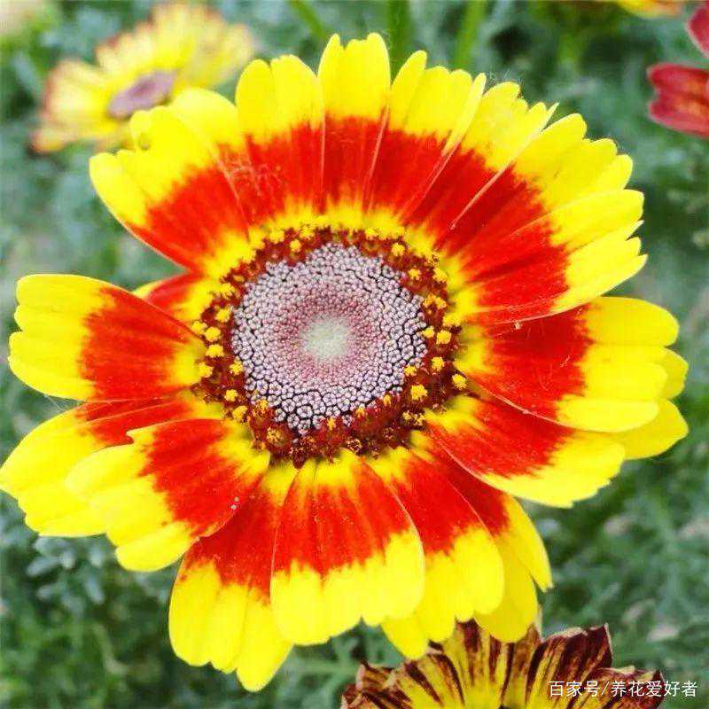 花环菊又叫花轮菊、彩虹菊、三色菊等,是菊科茼蒿属草本植物。它花形秀美,花色鲜艳,花冠通常呈红、黄、白、紫等二、三色的复色环状,花姿娇媚可人,盆栽于室内,鲜艳夺目,缤纷多彩,给人一种生机盎然、热情活泼的感觉。