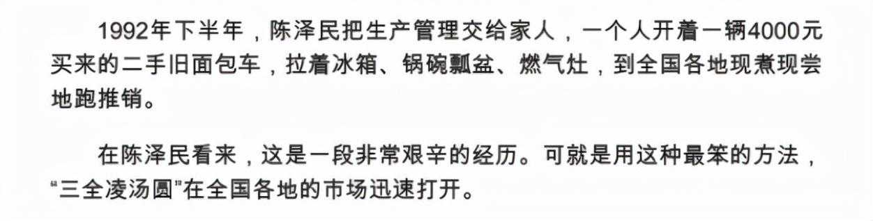 按照陈泽民自己的回忆,是自己在各大商场门口直接煮汤圆,发给去商场的顾客品尝,免费的东西大家都喜欢,吃了都说好,然后就愿意买。