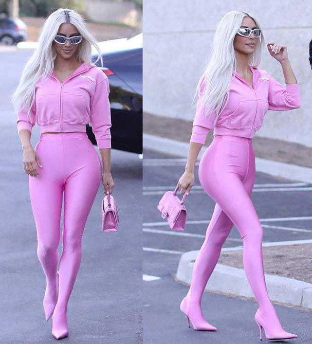 比如被金穿在身上的那条芭比裤,对于一般人来说不仅驾驭起来有困难,而且穿脱也是不太容易的,因为裤子和鞋子是连在一起的。但金对这个时尚单品很是偏爱,已经穿过好多条了,贴身的面料将其引以为傲的优势展现得淋漓尽致。